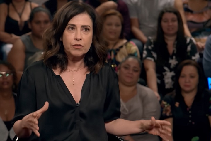 "Nem sei nem a falar o nome dela direito, é atriz e tal, Tilda Swinton. Ela é incrível", disse Fernanda, ao ser questionada por Fábio Porchat sobre quem ela gostaria de ser por um dia. Foto: Reprodução/TV Globo