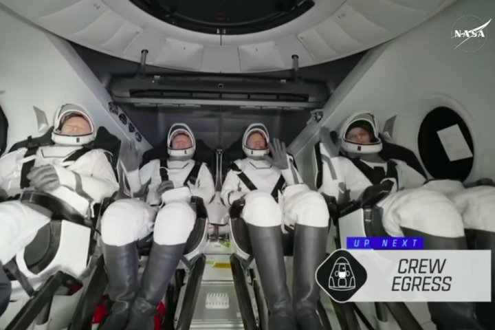 Os quatro saíram da cápsula acordados, sorrindo e acenando para as câmeras, e foram rapidamente levados em cadeiras para atendimento médico. Foto: reprodução/youtube nasa