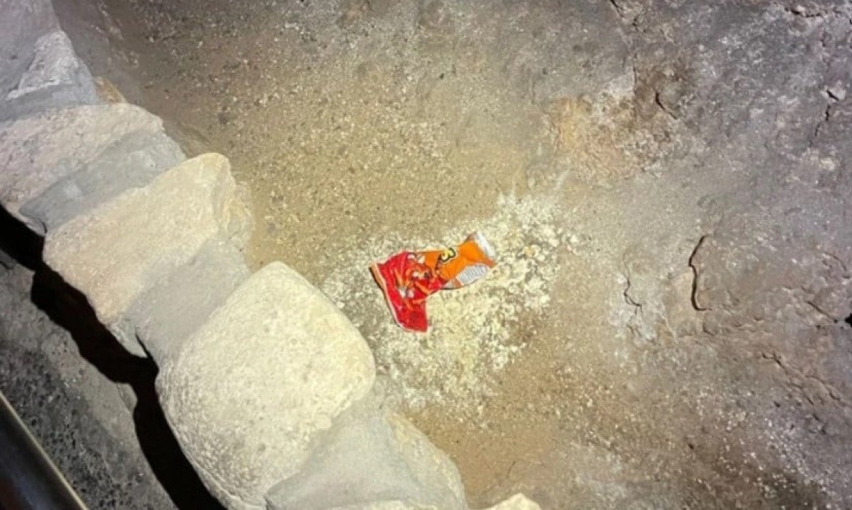 A embalagem do alimento à base de milho foi abandonada por um turista não identificado e sua permanência no local por horas seguidas provocou o surgimento de mofo no solo da caverna. A Administração do parque que abriga a caverna precisou fazer uma operação emergencial para remover os fungos da área. Foto: Jirka Matousek/Wikimedia Commons