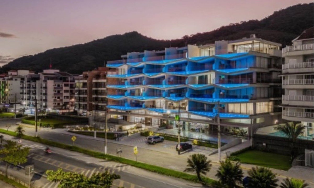 O edifício fica de frente para a Praia Grande, na região central de Ubatuba, e as pessoas, ao nadarem, são vistaas por quem passa pela orla e observa as sacadas do prédio. Foto: Divulgação Portfólio da VIW Residence