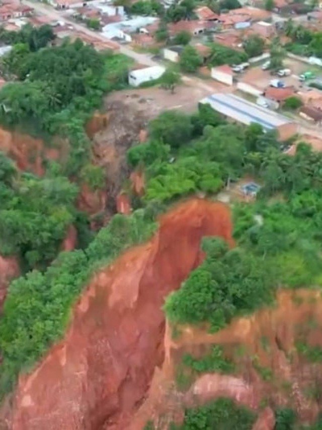 Aa terra que cai provoca imensas crateras que assustam os 71 mil habitantes. Há casas na beira de precipícios. Foto: Reprodução de vídeo Marinho Drones