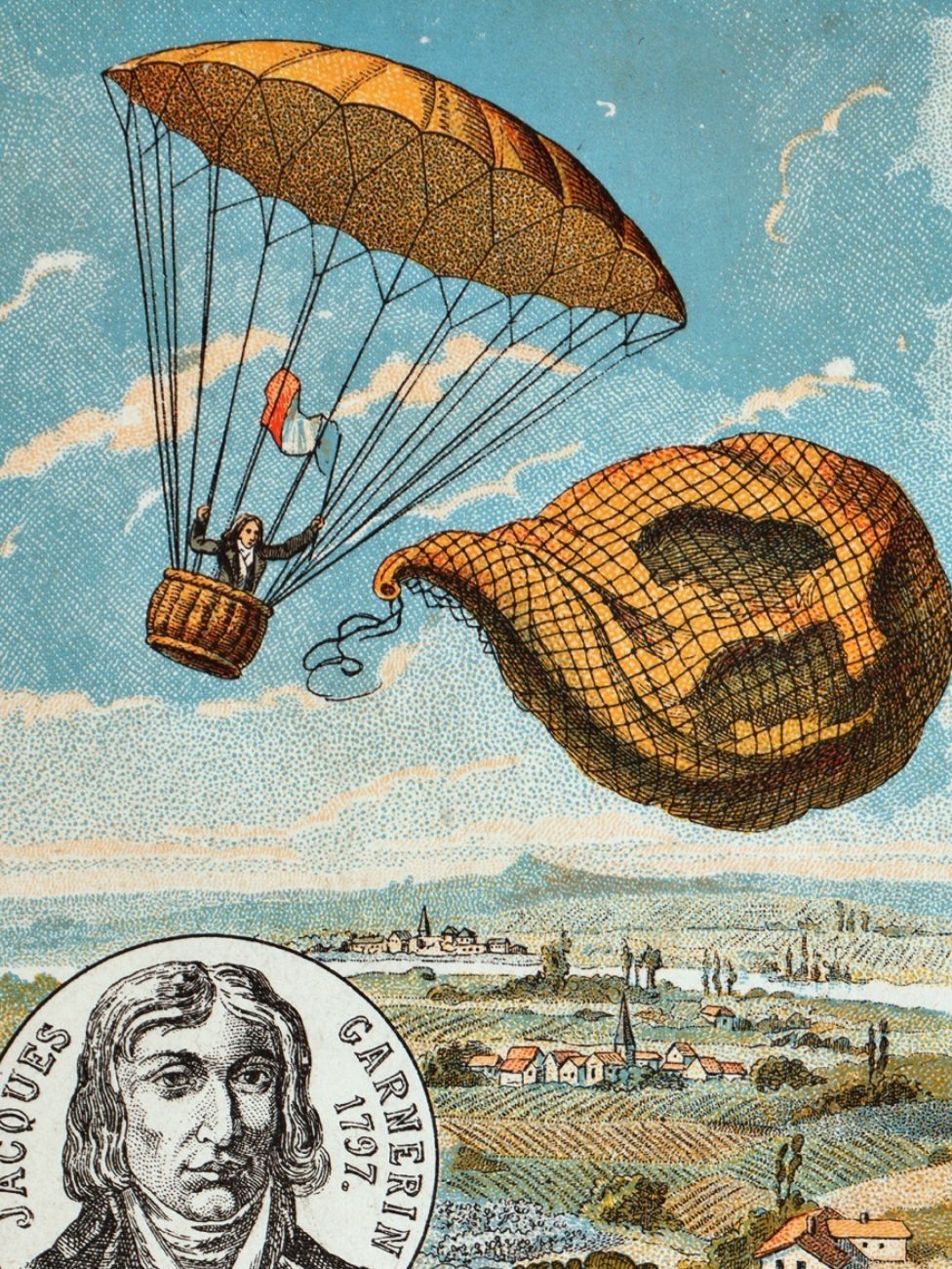 O francês Louis-Sébastien Lenormand (1757-1839), em 1783, saltou de uma árvore com dois guarda-sóis, um em cada mão. No entanto, foi André-Jacques Garnerin (1796-1823) que marcou seu nome na história deste dispositivo. Foto: Domínio Público