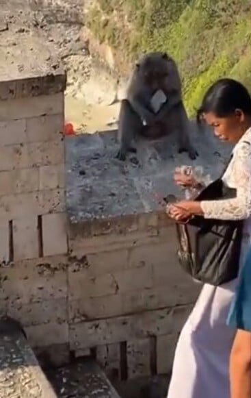 A "negociação" entre a mulher e o primata foi filmada no Templo de Uluwat, na Ilha de Bali, na Indonésia. Foto: Reprodução/Redes Sociais