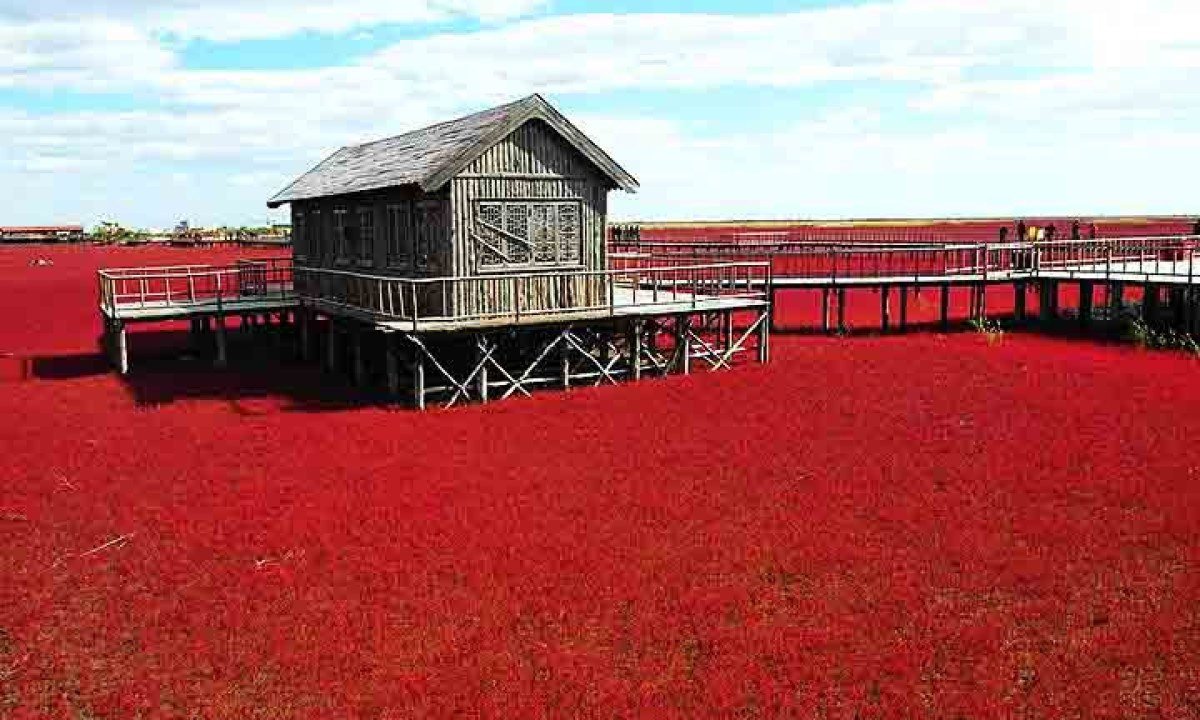 Nessa zona pantanosa há a presença de uma planta denominada Suaeda salsa. Entre os meses de setembro e outubro, ela se "exibe" com uma cor vermelha bastante intensa. Foto: Reprodução de instagram