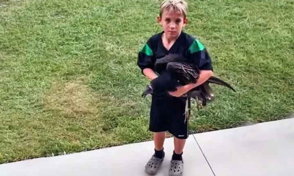 “Eu não sei o que é isso”, respondeu o garoto, segurando o abutre como se fosse um bichinho de estimação. Durante o vídeo, o menino aparentava acreditar ter uma galinha nas mãos. Mas logo foi alertado por seu pai. “Isso não é uma galinha. Pare de fazer carinho”. Foto: Reprodução de vídeo Reddit