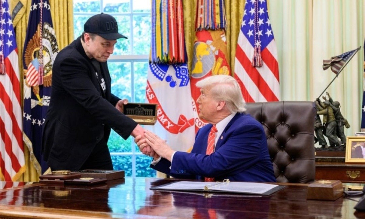 Mas o que chamou a atenção dos jornalistas na despedida de Musk, no Salão Oval da Casa Branca, foi o hematoma no olho do bilionário. Foto: Reprodução YouTube Casa Branca