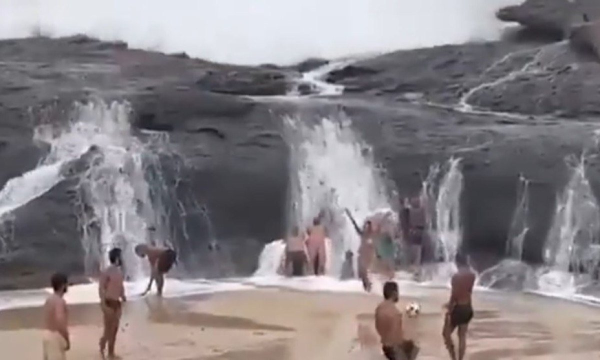 Nas imagens, que circularam nas redes sociais, banhistas se divertiam sem qualquer preocupação numa área de pedras. Por causa das rochas, a água chegava a formar suaves cascatas.. Foto: Reprodução redes sociais
