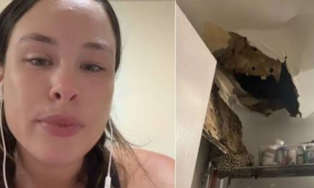O teto caiu levando os insetos para dentro da casa. Carolina disse que nunca gritou tanto. Ela chorou, correu e teve que ir temporariamente para um hotel. Foto: Reprodução de vídeo TikTok