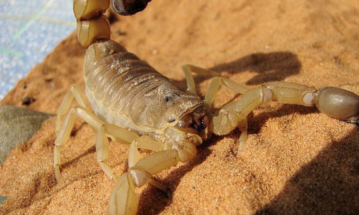 Escorpião-amarelo - Seu veneno é ainda mais forte que o do escorpião-marrom. Ele mede cerca de 7 cm. Ambas as espécies podem causar danos ao sistema nervoso, dor, bolhas na pele, tosse, vômito e falta de ar. Foto: Fernanda/Wikimedia Commons