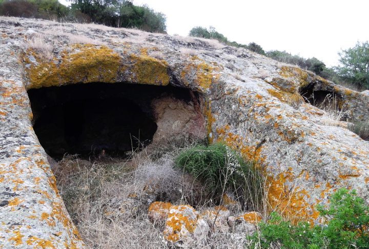 Um dos complexos funerários mais relevantes é Sant’Andrea Priu, em Bonorva. Fica escavado em um afloramento de lava vulcânica com 180 metros de extensão e 10 metros de altura. Foto: Wikimedia Commons/Gianni Careddu