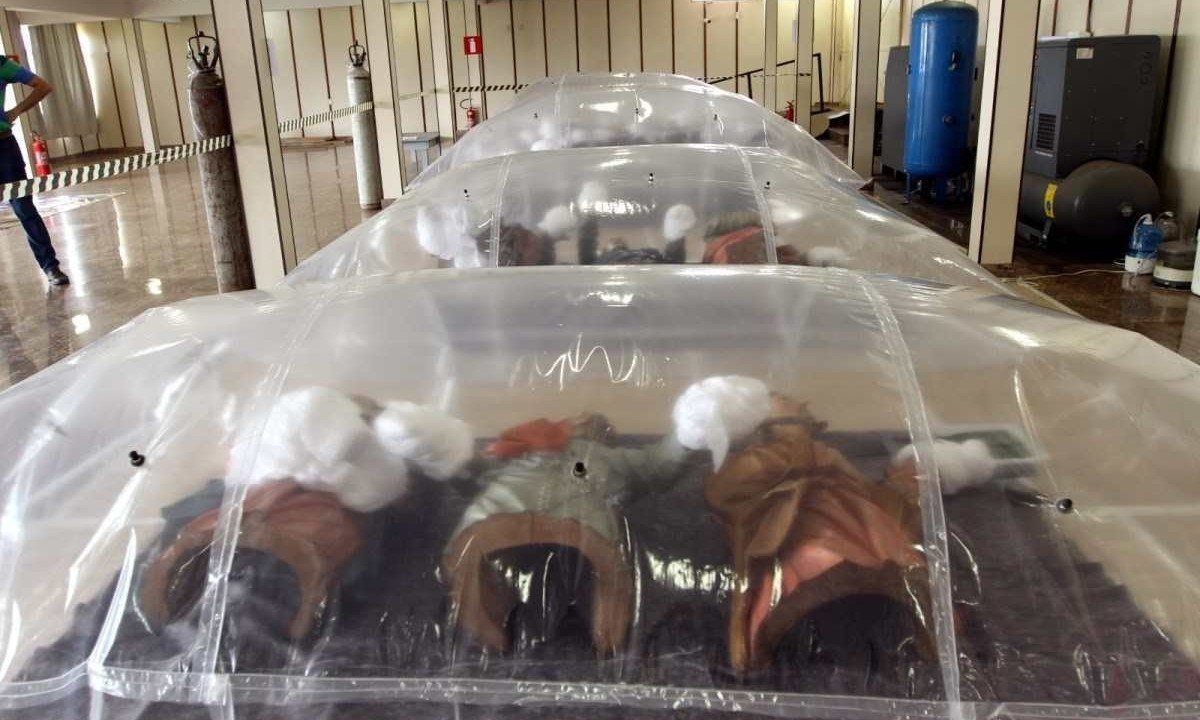 Siga noCongonhas – Um acervo extraordinário do Barroco brasileiro, com reconhecimento internacional, se encontra, neste exato momento, dentro de cinco gigantescas bolhas de plástico. O motivo é justo, necessário e preventivo. Pela primeira vez em sua história, as 15 peças esculpidas por Antônio Francisco Lisboa, o Aleijadinho (1738-1814), que formam a Santa Ceia, em Congonhas, na Região Central de Minas, passam pelo processo de desinfestação denominado anóxia ou anoxia, para matar cupins e evitar a proliferação dos insetos, caso presentes na madeira.