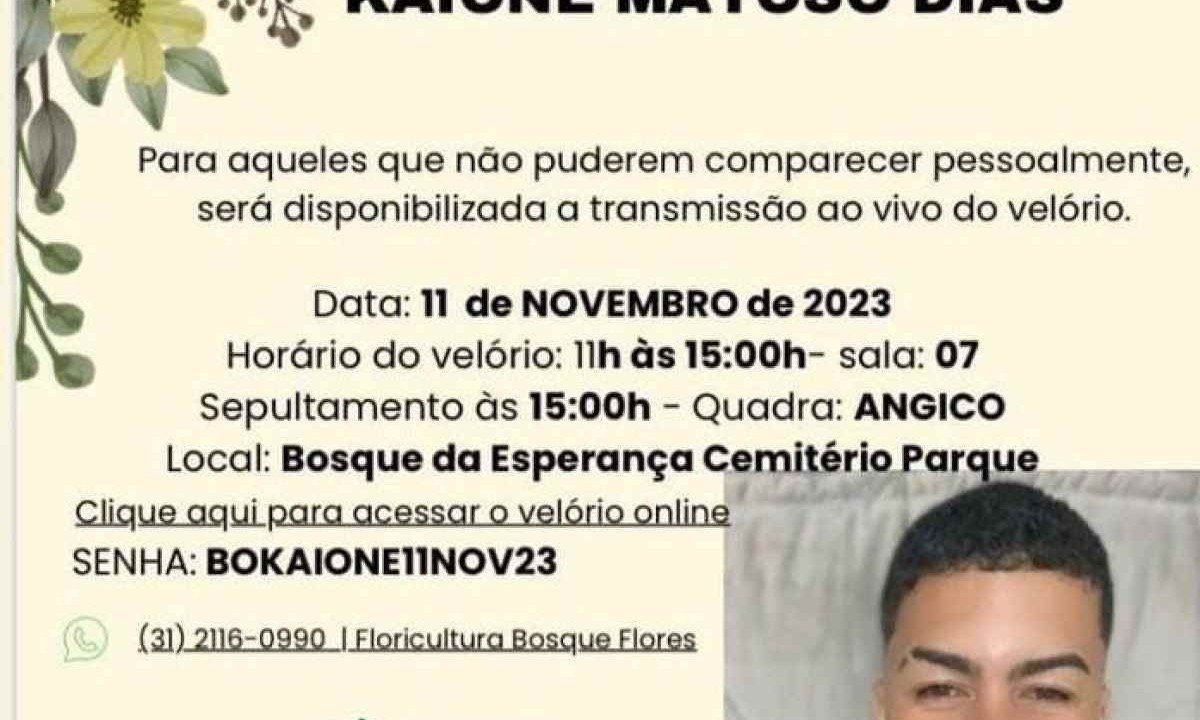Siga noO velório de Kayone Matoso Dias, morto após ser esfaqueado pelo porteiro do prédio em que morava em Vespasiano, na Grande BH, no último domingo (5/11), vai acontecer neste sábado às 11h no Cemitério Bosque da Esperança, no Bairro Jaqueline, Região Norte da capital. O enterro está programado para as 15h.