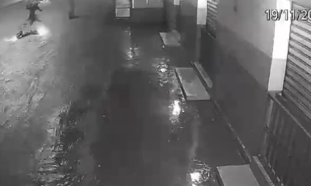 As imagens foram gravadas pelo circuito de segurança de uma loja na Avenida Sebastião de Brito, no Bairro Dona Clara, na Região da Pampulha. Nelas, é possível ver o motoqueiro subindo a rua em meio a enxurrada.