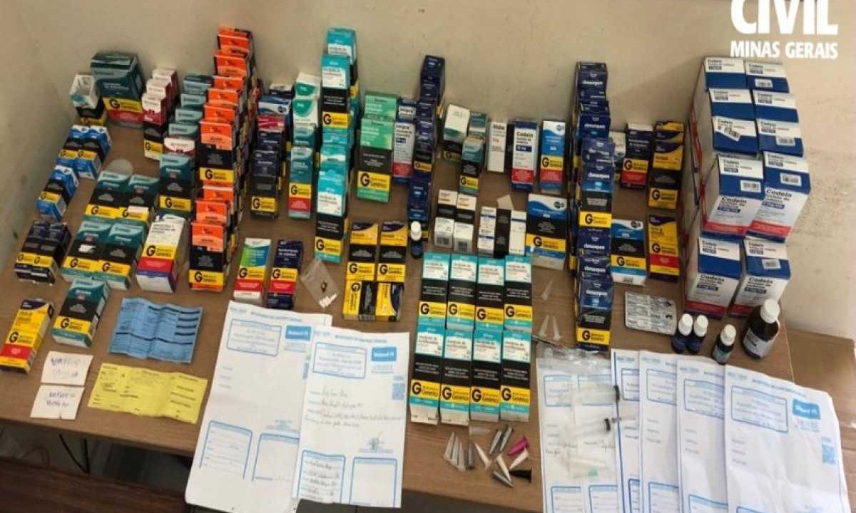 A Polícia Civil apreendeu mais de cem caixas de remédios controlados, receitas médicas com assinaturas falsas, cocaína e maconha