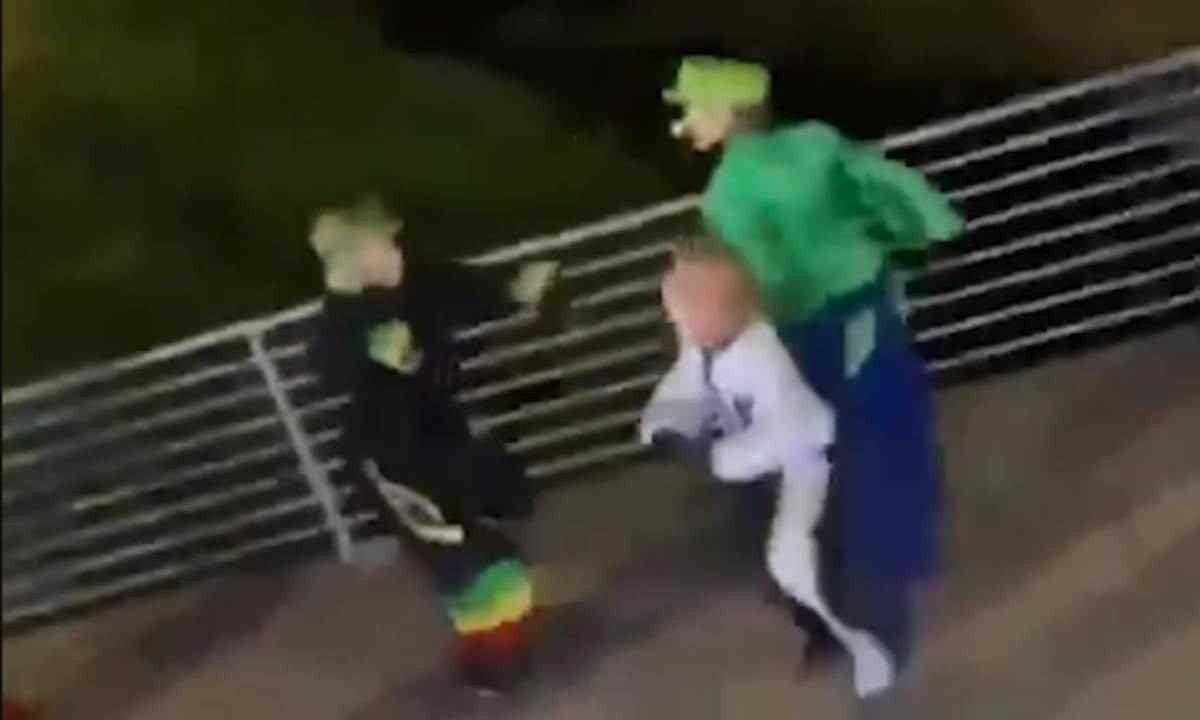 As imagens mostram o momento em que a confusão se iniciou entre os personagens do 'Chaves' e o 'Luigi', do 'Super Mario Bros'.