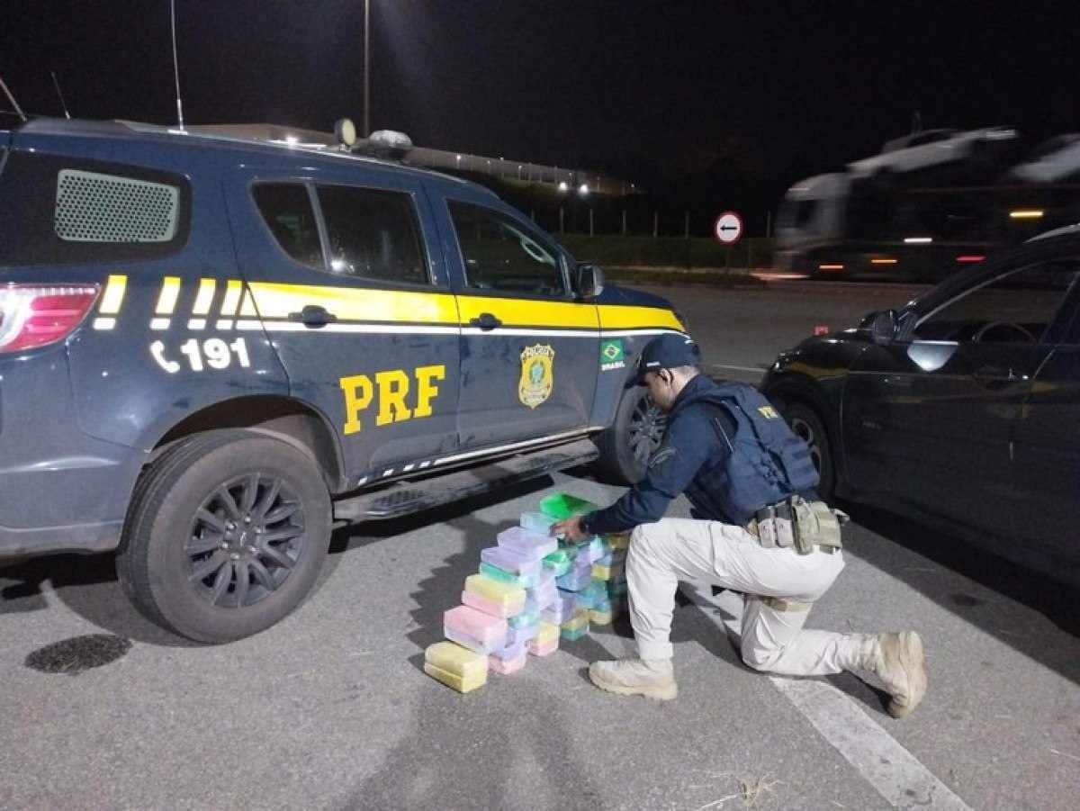 O veículo ocupado pelos suspeitos foi parado na altura do Km 389 da rodovia. A droga estava escondida no compartimento onde deveria estar o pneu reserva do veículo. O motorista de 27 anos e o passageiro, de 51, disseram que saíram com a droga de Cuiabá (MT) e levariam para a Região Metropolitana de Vitória (ES).