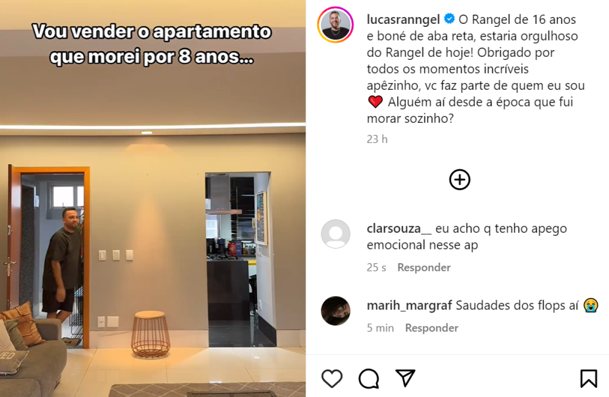 "O Rangel de 16 anos e boné de aba reta, estaria orgulhoso do Rangel de hoje! Obrigado por todos os momentos incríveis apêzinho, você faz parte de quem eu sou", escreveu ele em uma postagem na rede social. O influenciador também publicou um vídeo para anunciar a despedida do imóvel.