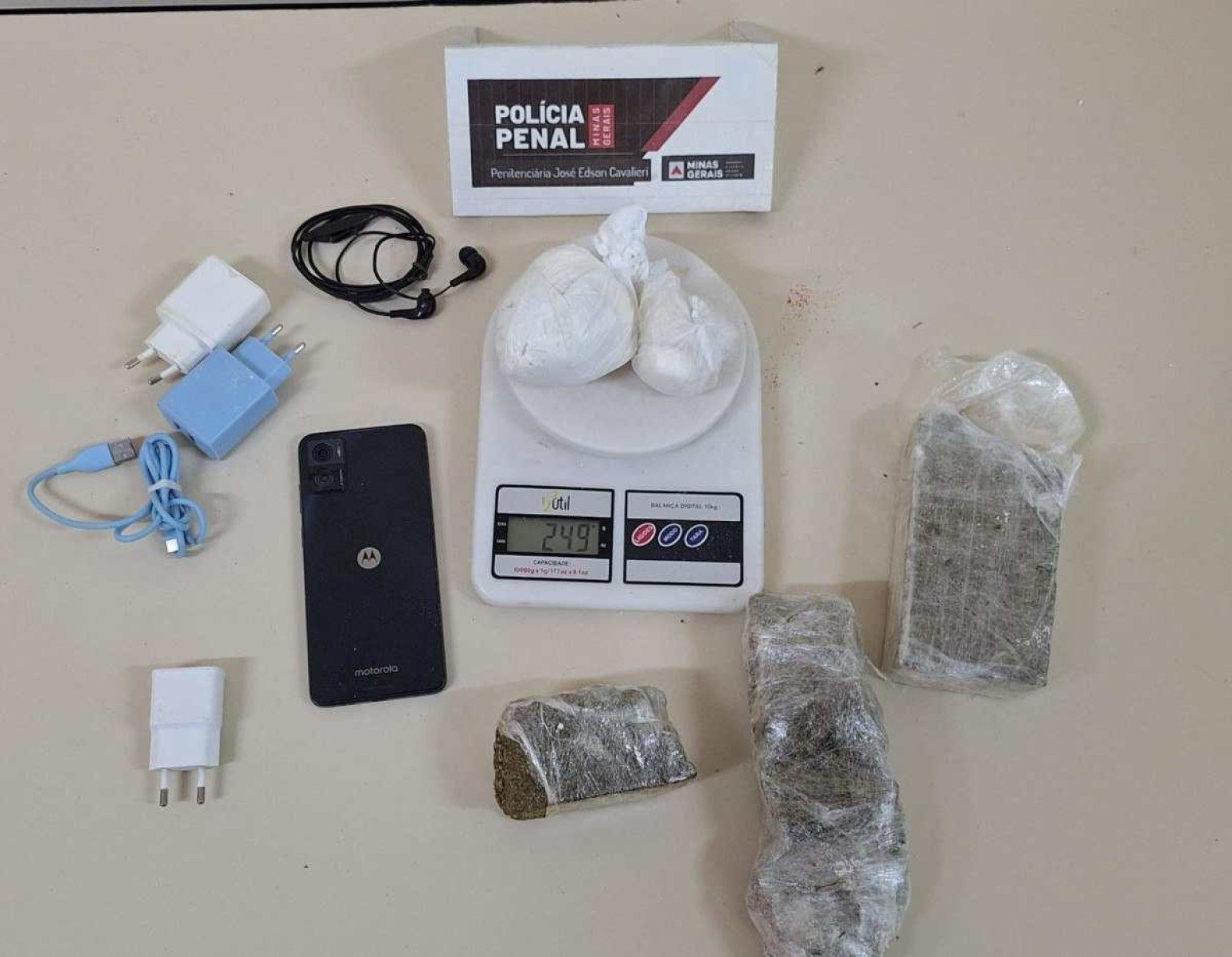 Foram apreendidos três porções de maconha (753 gramas), duas de cocaína (249 gramas), um celular, três carregadores, um fone de ouvido e temperos.