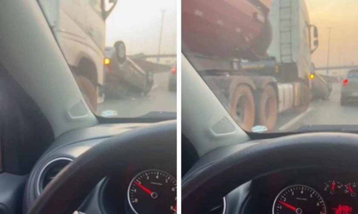 Segundo a Arteris, concessionária que administra a pista, a batida lateral entre os veículos terminou com o carro Hyundai HB20 capotado na faixa da esquerda no sentido Belo Horizonte.