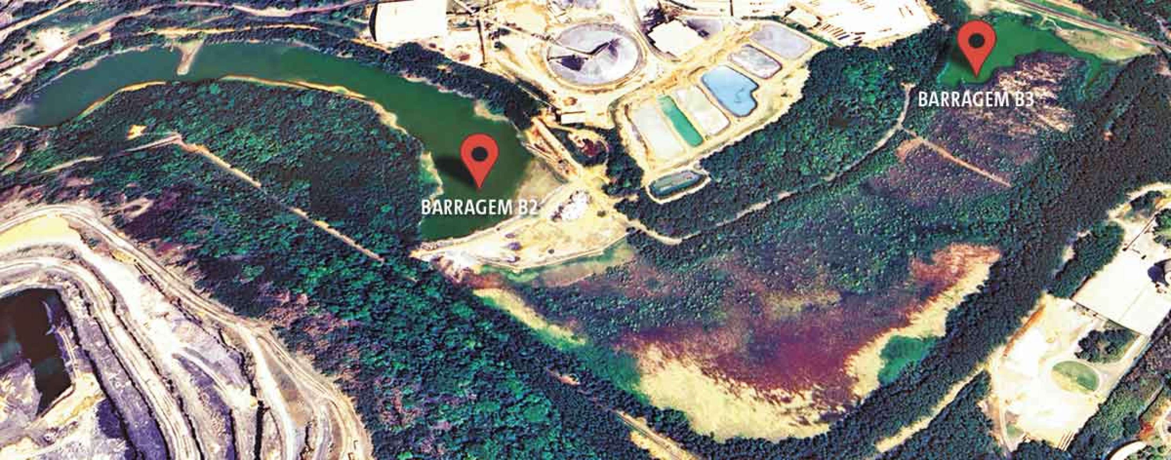A barragem abaixo, a B3, contém 733,4 mil m3 de sedimentos. Em ambas a ANM indicou a existência de “umidade ou surgência (infiltrações) nas áreas de jusante (paredes externas da barragem voltadas para o sentido da água que deixa o reservatório), além de paramentos, taludes ou ombreiras (estruturas que se apoiam no terreno e constituem o barramento construído) sem implantação das medidas corretivas necessárias”.