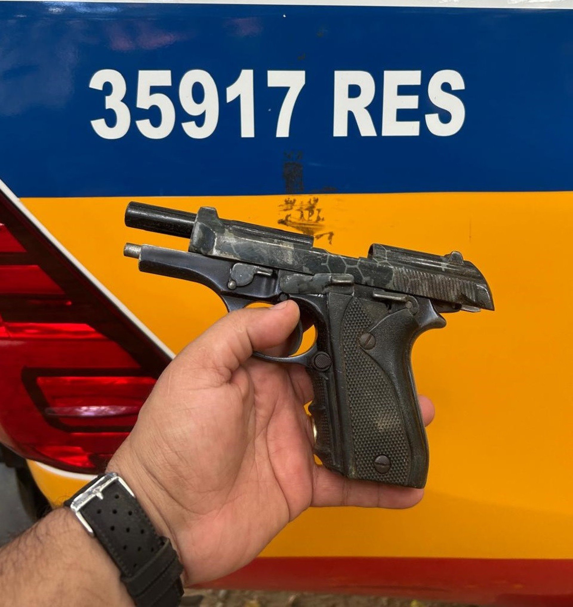 Dentro da bolsa, os militares descobriram uma pistola Beretta calibre .380, municiada com dez cartuchos intactos, além de dois carregadores, sendo um alongado e outro comum, também carregados com munição. Foram encontrados ainda outros seis cartuchos calibre .38 e um de 9mm, todos sem disparos.