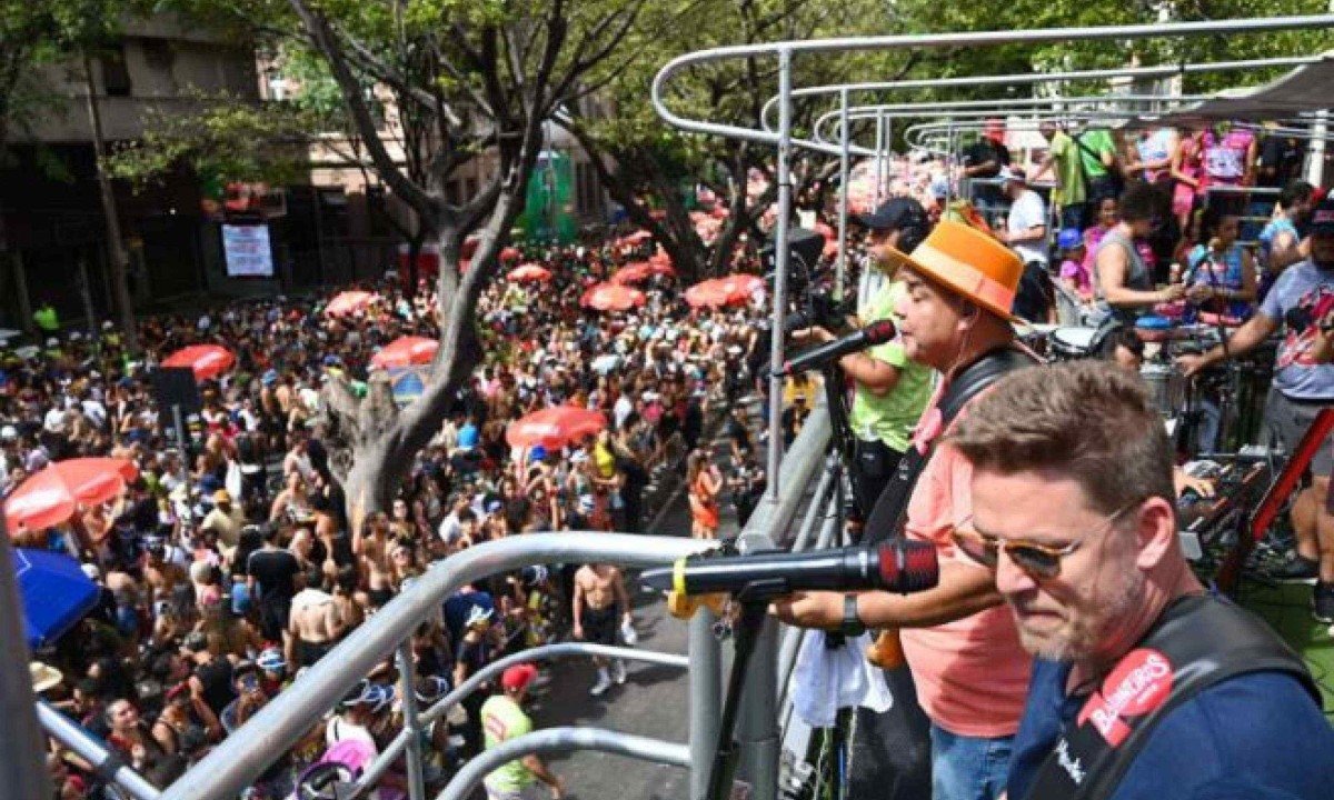 Durante cortejo na Avenida Amazonas, em Belo Horizonte, vocalista da banda pede para foliões aproveitarem para beijar muito