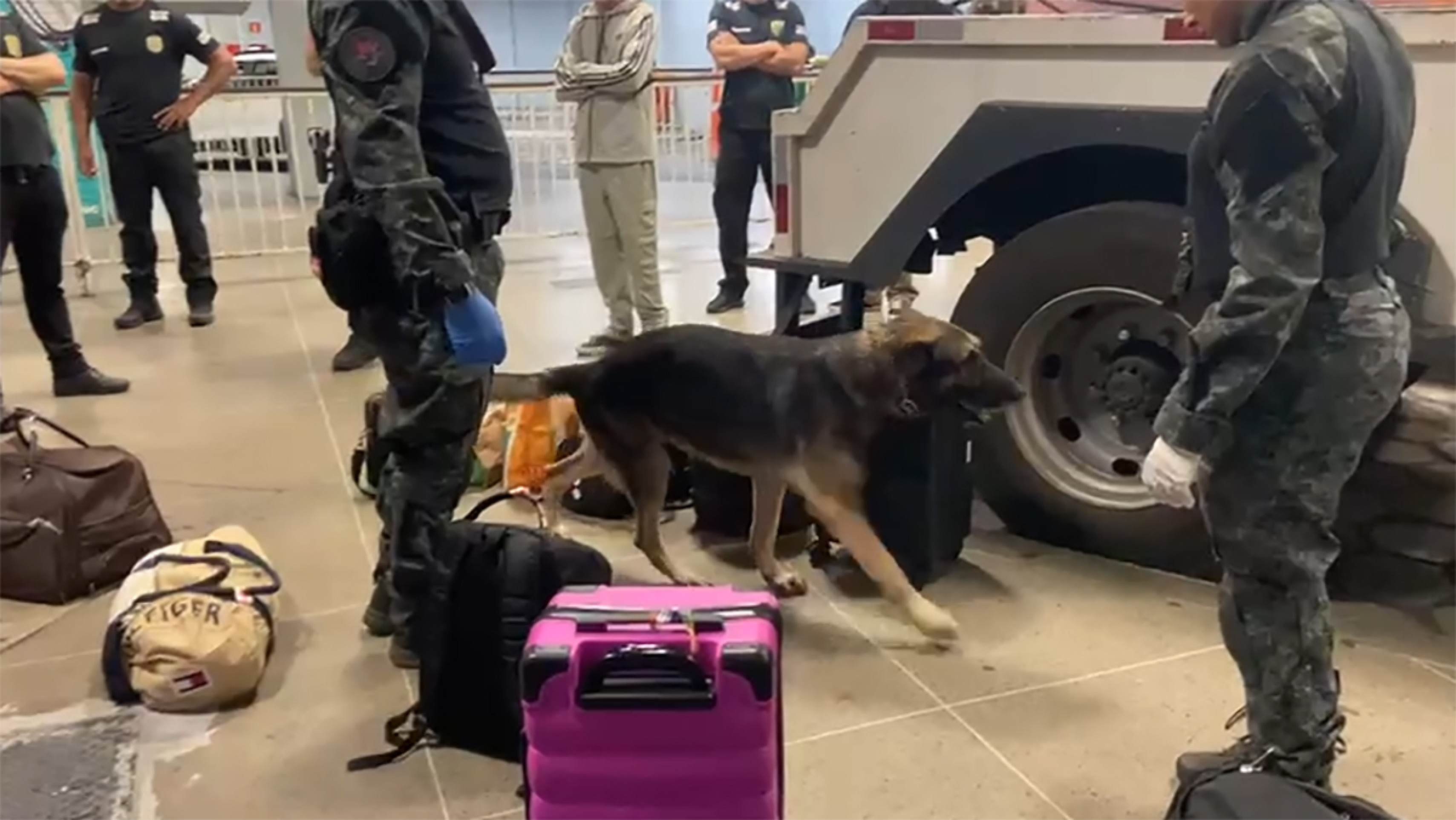 A ação ocorreu na área de desembarque. As bagagens são enfileiradas e o cão as percorre, farejando até que encontre entorpecentes.