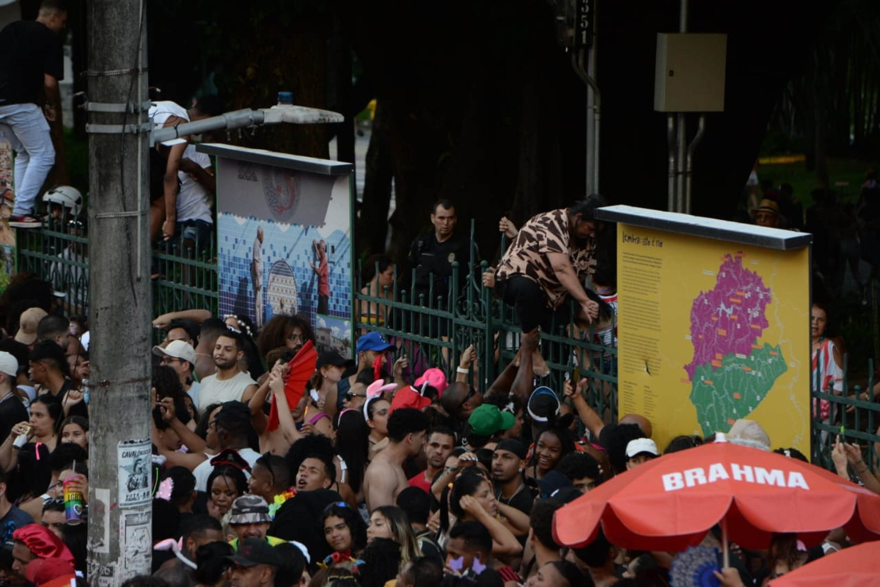 Foliões que estavam espremidos e acompanhavam o cortejo do bloco Pipoquinha do Alok, na Avenida Afonso Pena, no Centro de Belo Horizonte, invadiram o Parque Municipal. Depois de dezenas de pessoas pularem as grades, a Guarda Civil Municipal abriu os portões e liberou a entrada. A multidão está reunida desde as 14h na região.