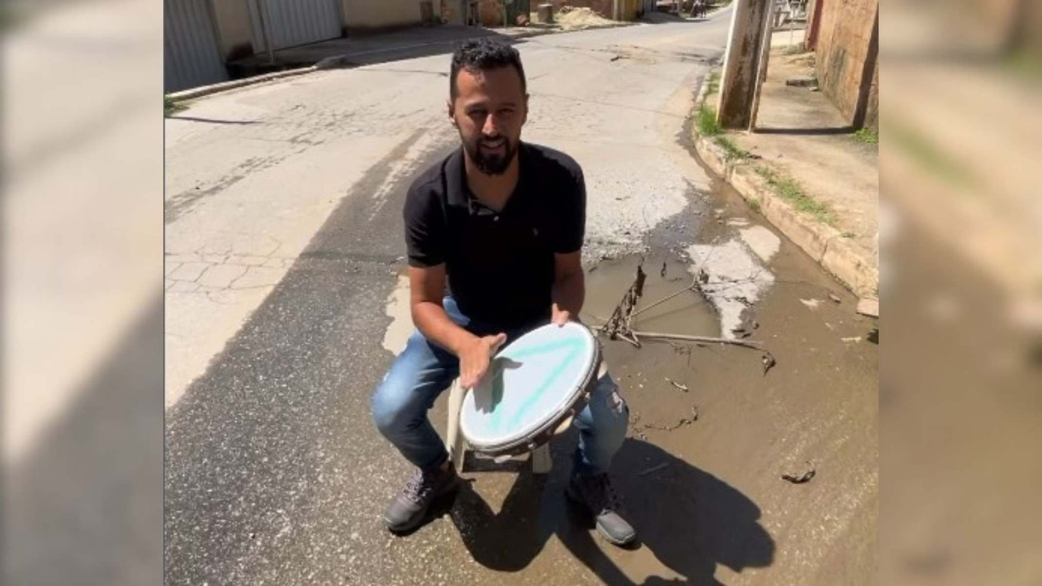 Com um pandeiro na mão e um buraco cheio de água suja ao fundo, o vereador Fernando Pereira da Silva (PP), mais conhecido como Nandinho, fez um apelo por obras na Avenida I, no Bairro Castanheira, em Santa Luzia, na Grande BH.