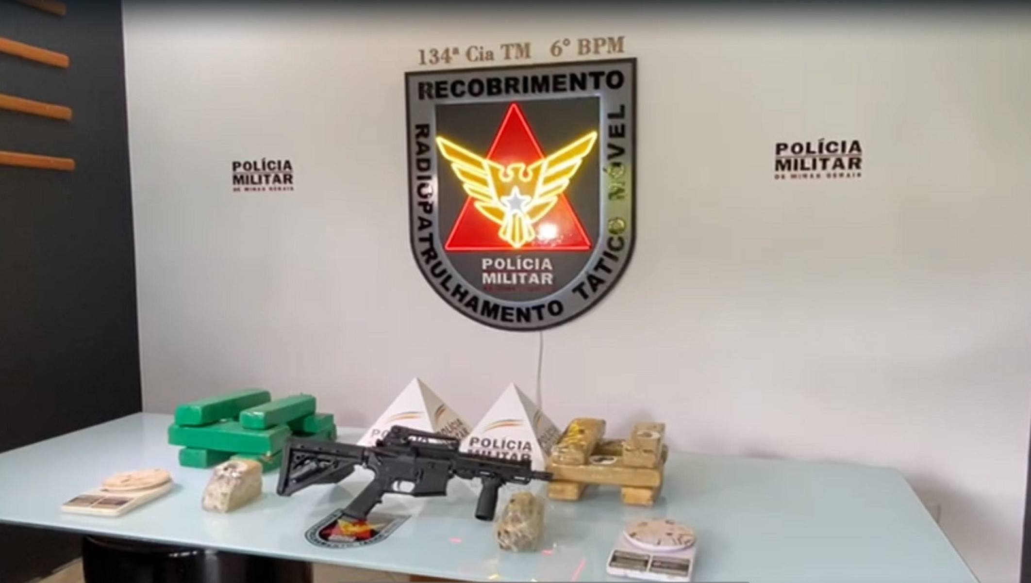 A ação resultou na apreensão de 14 barras de maconha, de balanças de precisão e da carabina, da marca Colt, de calibre 5.56x45. Junto com a arma, havia um carregador com capacidade para 40 projéteis. Todos os itens foram encaminhados ao 6º Batalhão da PMMG.