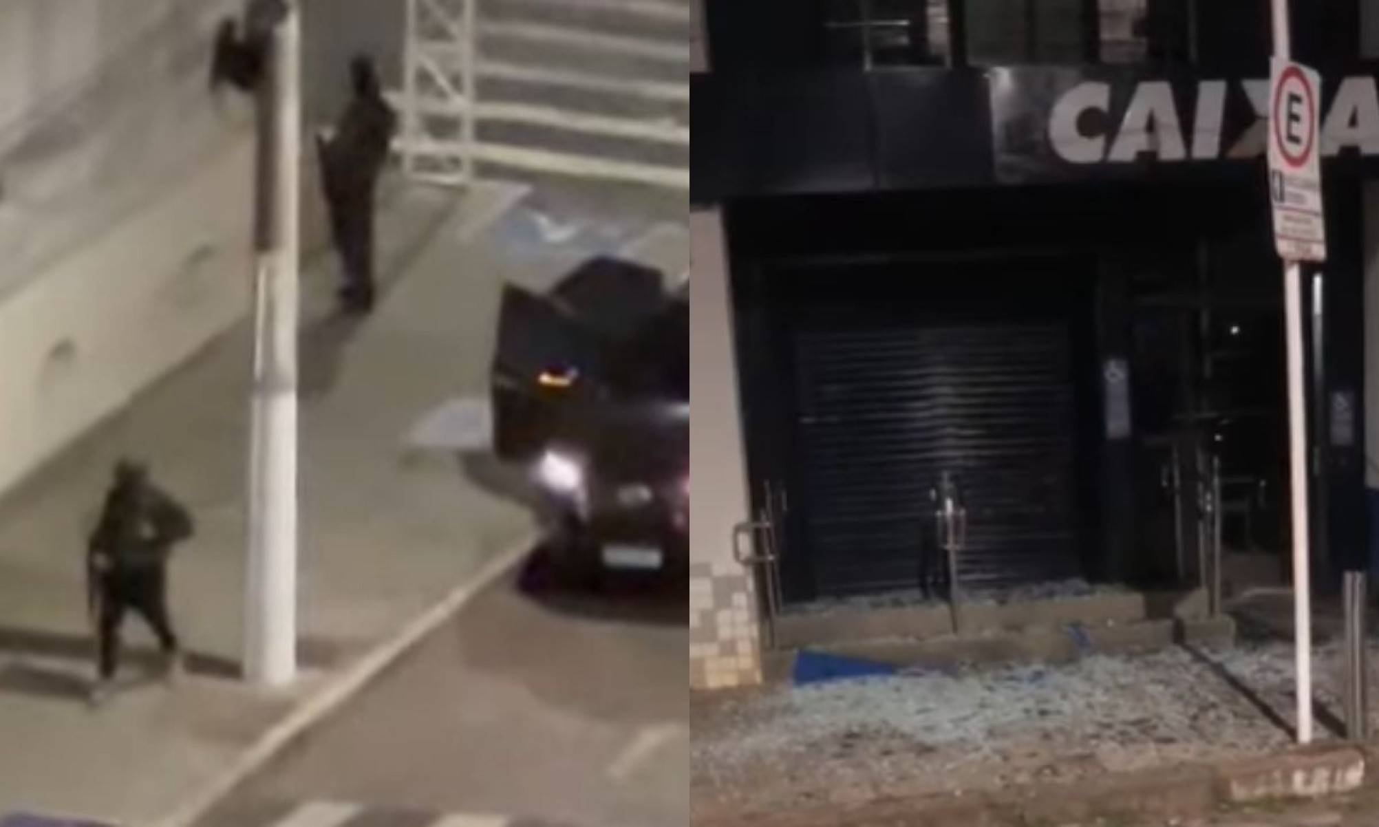 Vídeos que circulam nas redes sociais mostram o momento do ataque. Segundo a Polícia Militar, os suspeitos chegaram em pelo menos cinco veículos e cercaram a área do banco.