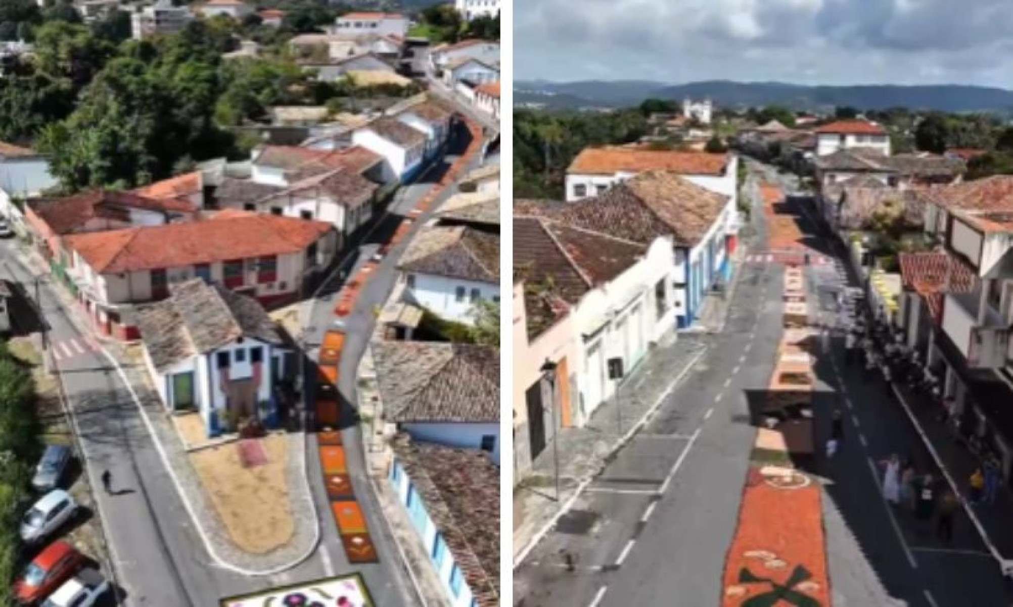 Os tapetes são feitos com serragem colorida, flores, borra de café e outros materiais.