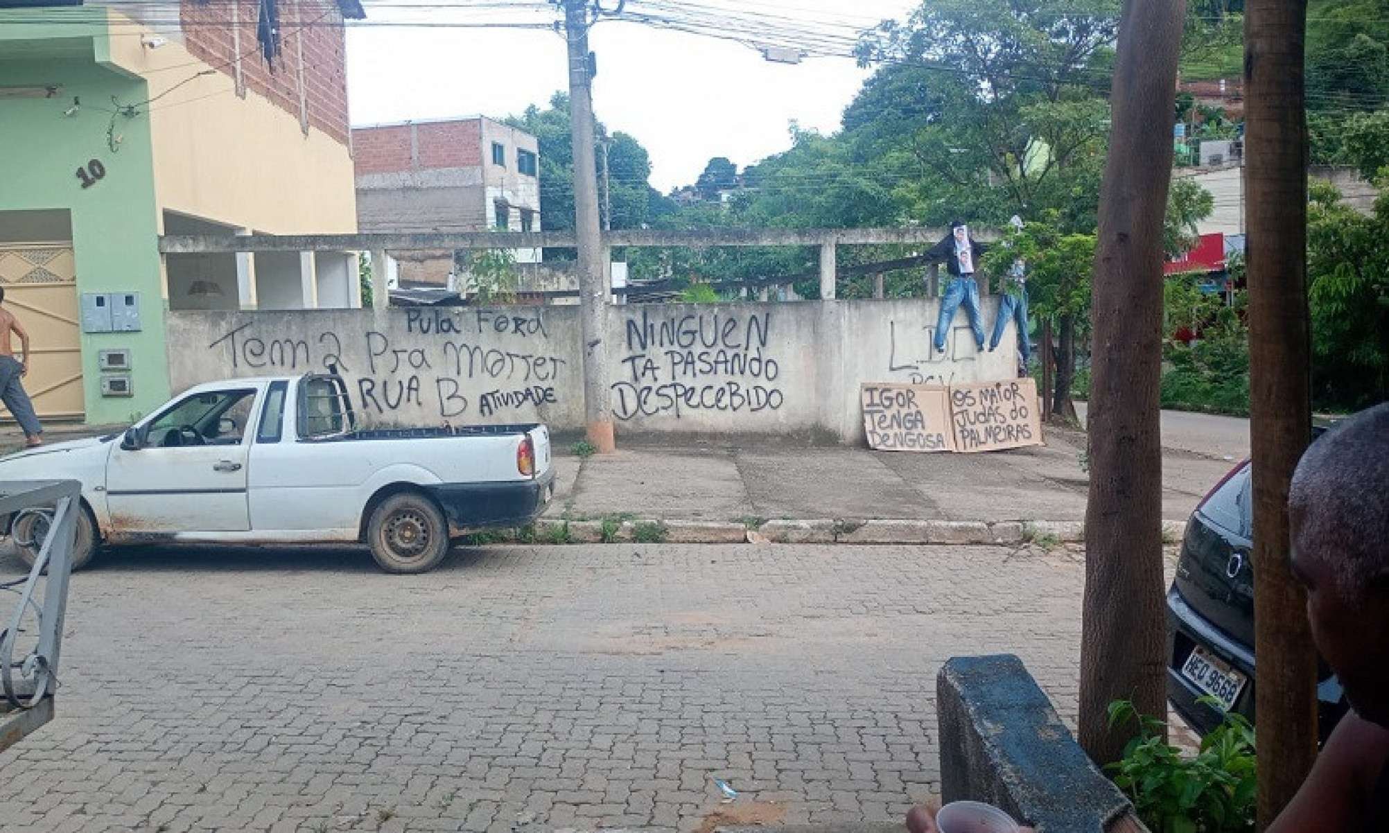 Já nos cartazes, lê-se “Igor, Tenga e Dengosa” e “Os maior judas do Palmeiras”.