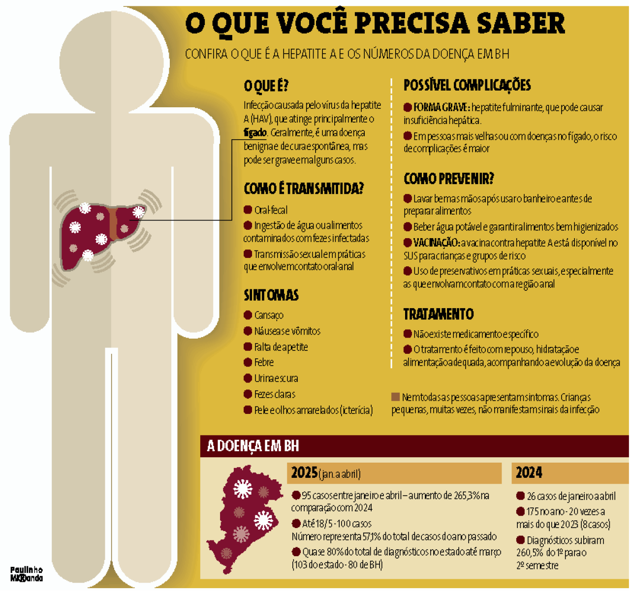 Siga noBelo Horizonte vive um surto de hepatite A neste ano, doença que causa uma inflamação aguda no fígado. Ainda sem um diagnóstico sobre o que motivou a escalada das infecções, o município, que concentra quase 80% de todos os casos em Minas Gerais, acionou o Ministério da Saúde e agora um relatório conclusivo deve ser finalizado até a segunda quinzena de junho. O volume de notificações na capital mineira já supera mais da metade do total registrado ao longo de todo o ano passado.