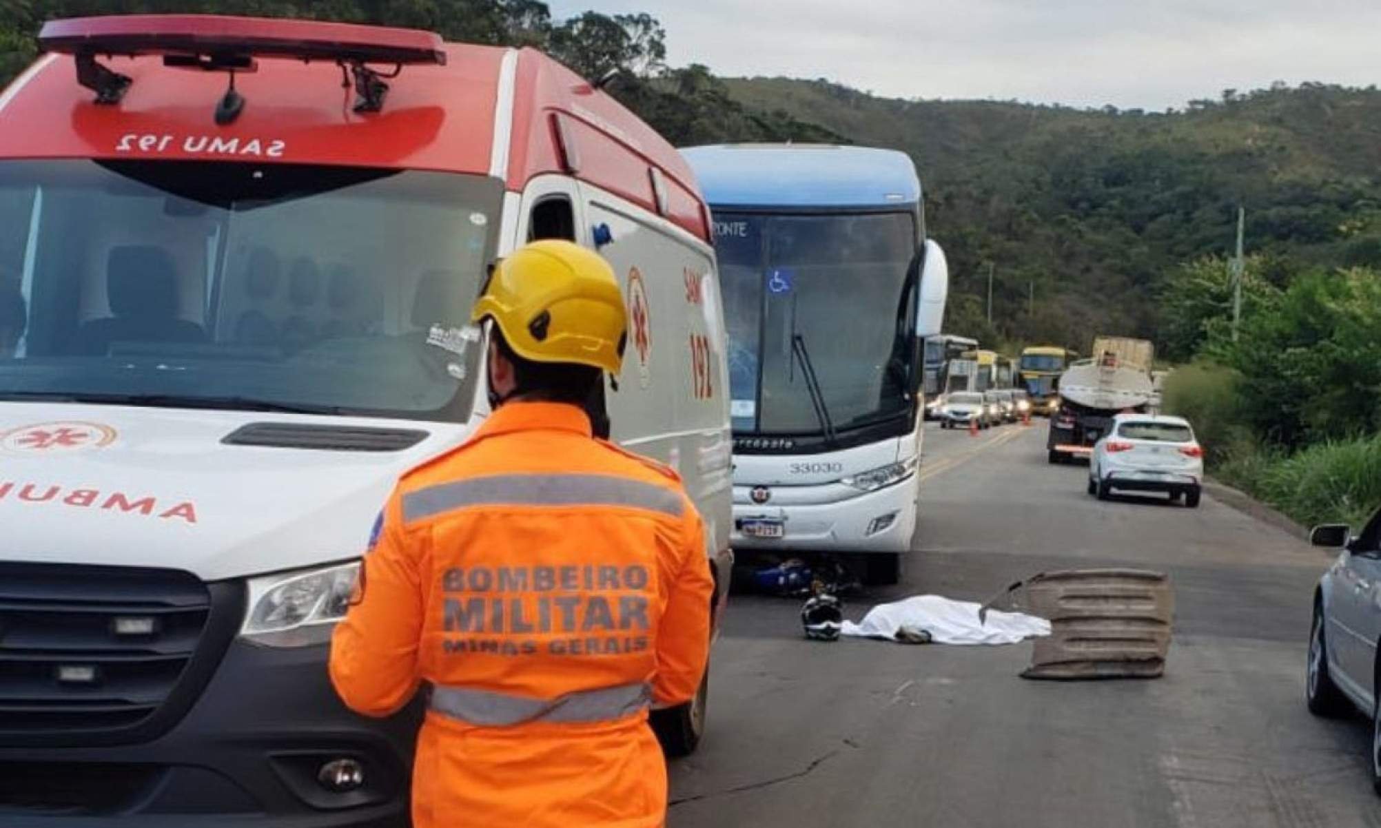 Um motociclista, ainda não identificado, morreu depois de se envolver em um acidente com um ônibus na BR-381, na altura de Ravena, distrito de Sabará, na Região Metropolitana de Belo Horizonte, na manhã desta sexta-feira (9/5).