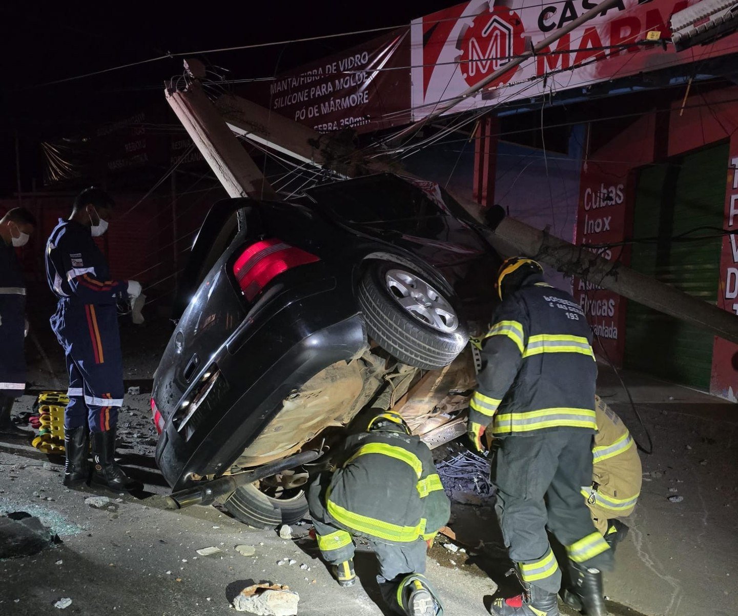 De acordo com o Corpo de Bombeiros, o motorista de um Golf perdeu o controle da direção e chocou-se violentamente contra um poste. Com o impacto da batida, o poste quebrou. Na sequência, o carro ficou suspenso, preso pelo próprio poste e pela fiação elétrica.