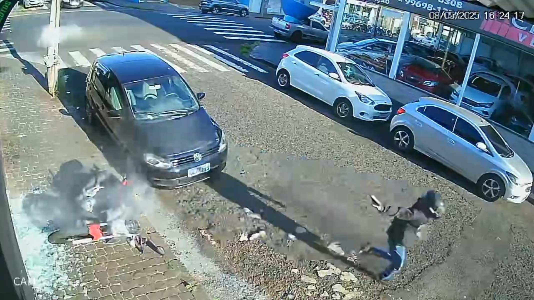 As imagens mostram os ladrões chegando em dupla em uma moto e invadindo a loja. Segundos depois, os tiros são percebidos com estilhaços se espalhando pela calçada e avenida.