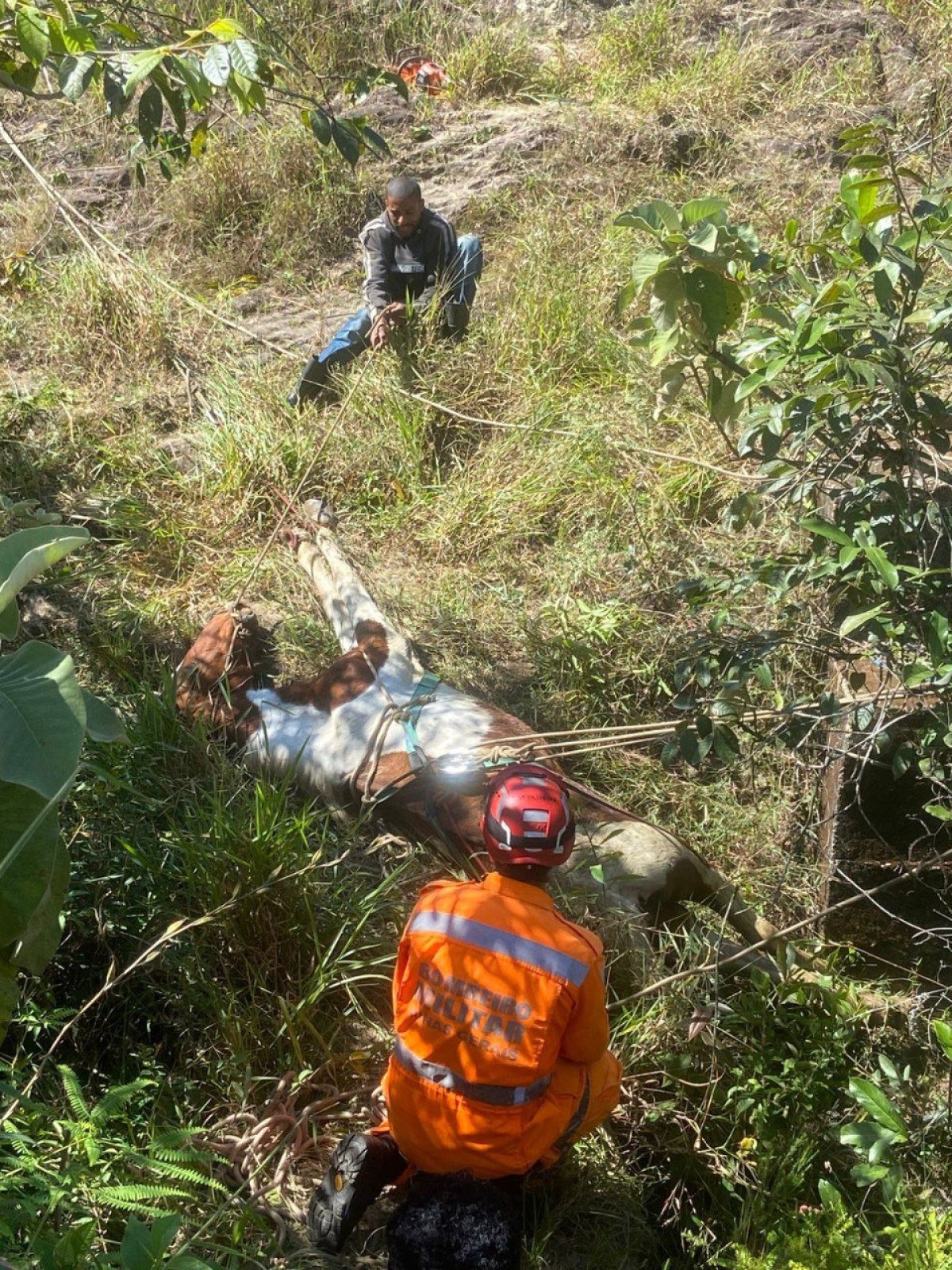 Após cerca de cinco horas de trabalho, utilizando cordas e polias, os militares conseguiram içar o animal de forma segura. Ele apresentava ferimentos leves e foi entregue aos cuidados do responsável, de acordo com os bombeiros.