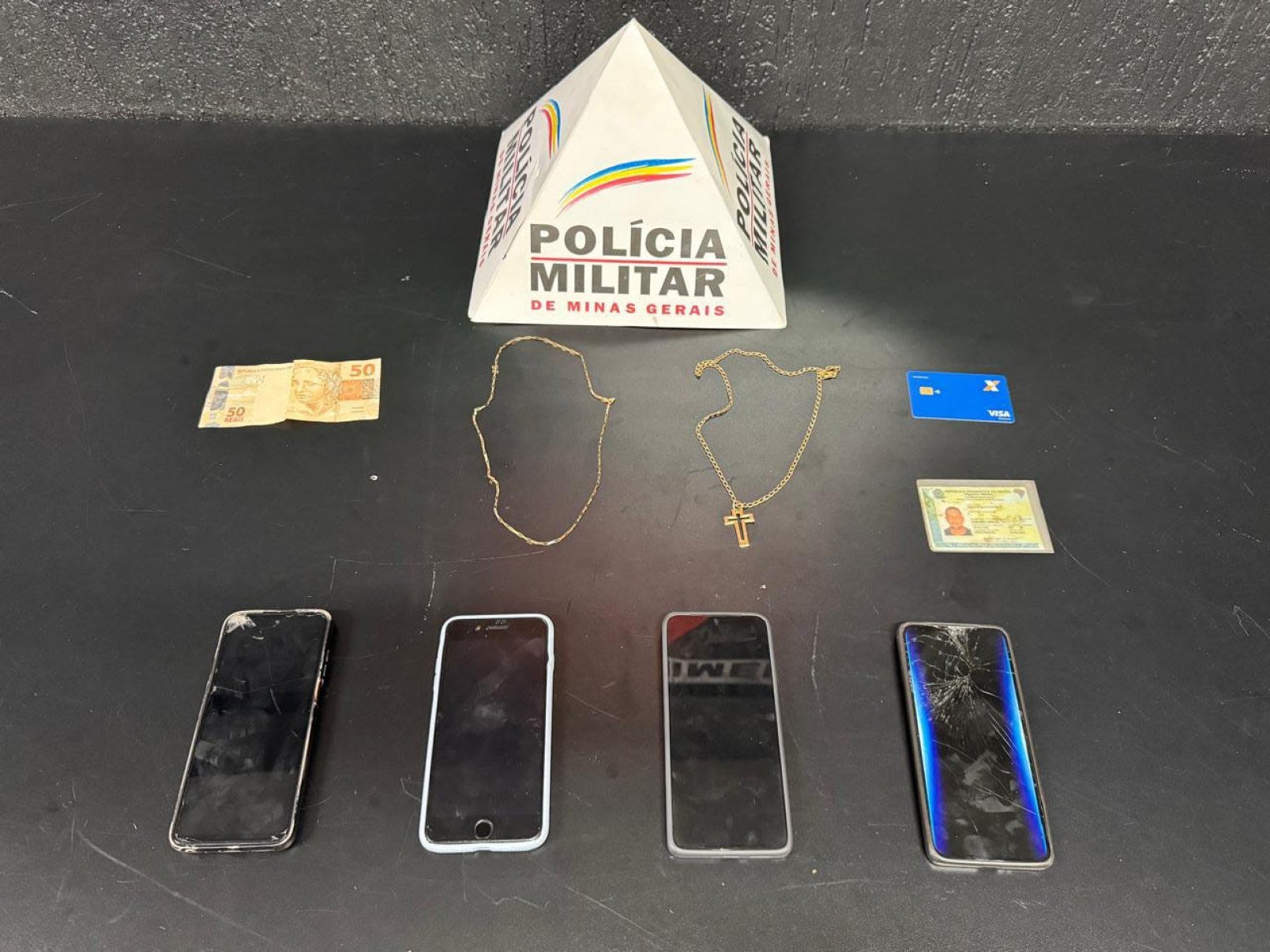 Em um vídeo, divulgado pela corporação, dois policiais encontraram os celulares e os cordões escondidos no carro, confira:
