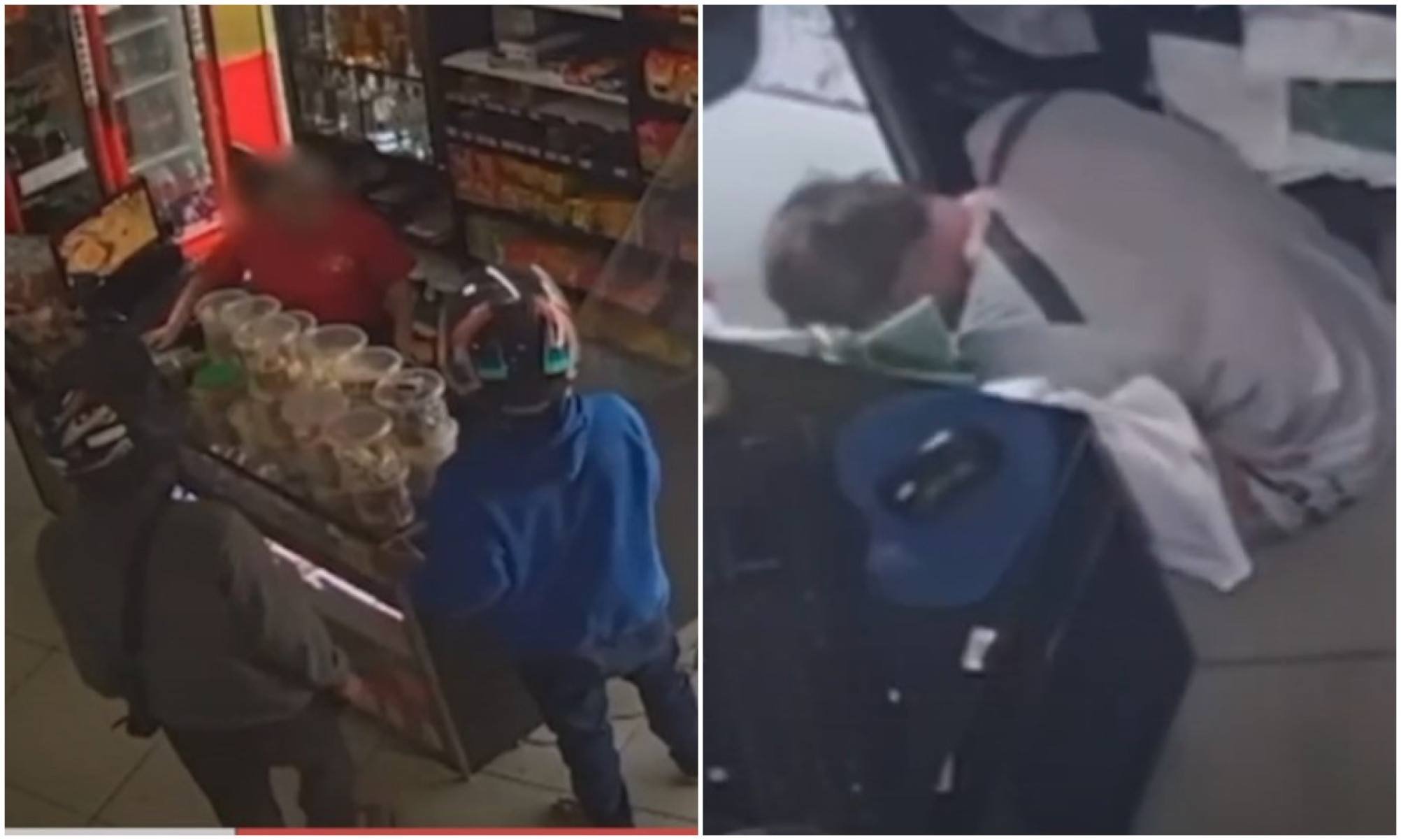 Conforme as imagens, os suspeitos entram no estabelecimento usando moletom e capacete. Eles falam algo com a funcionária do caixa e, quando o proprietário aparece, agressivamente um dos assaltantes vai para cima dele.