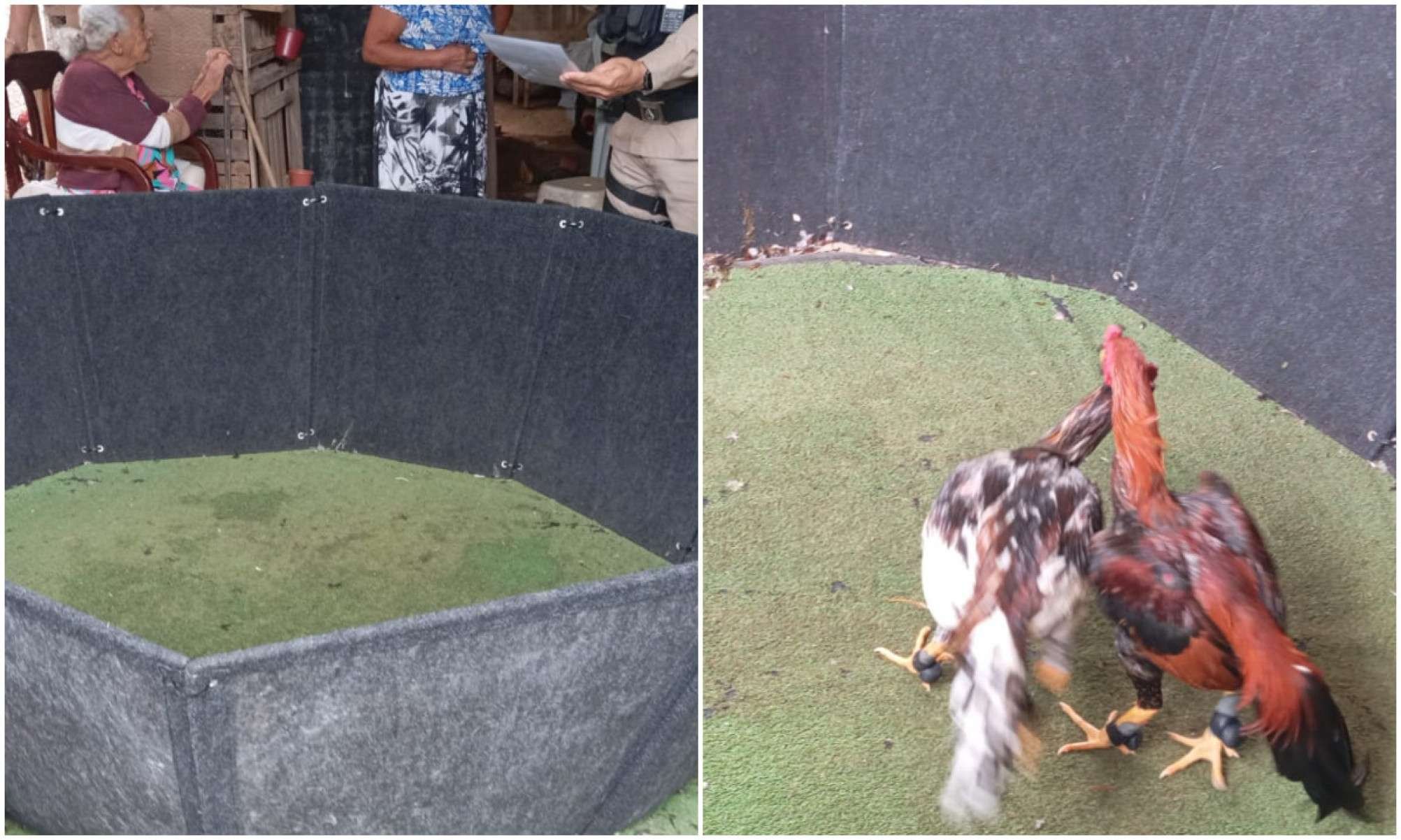 No imóvel, os militares presenciaram o momento no qual dois galos brigavam em uma arena. As aves foram apreendidas. Além disso, 65 animais, entre frangos e galos, estavam presos em gaiolas. Conforme a polícia, havia água e alimentação para eles.