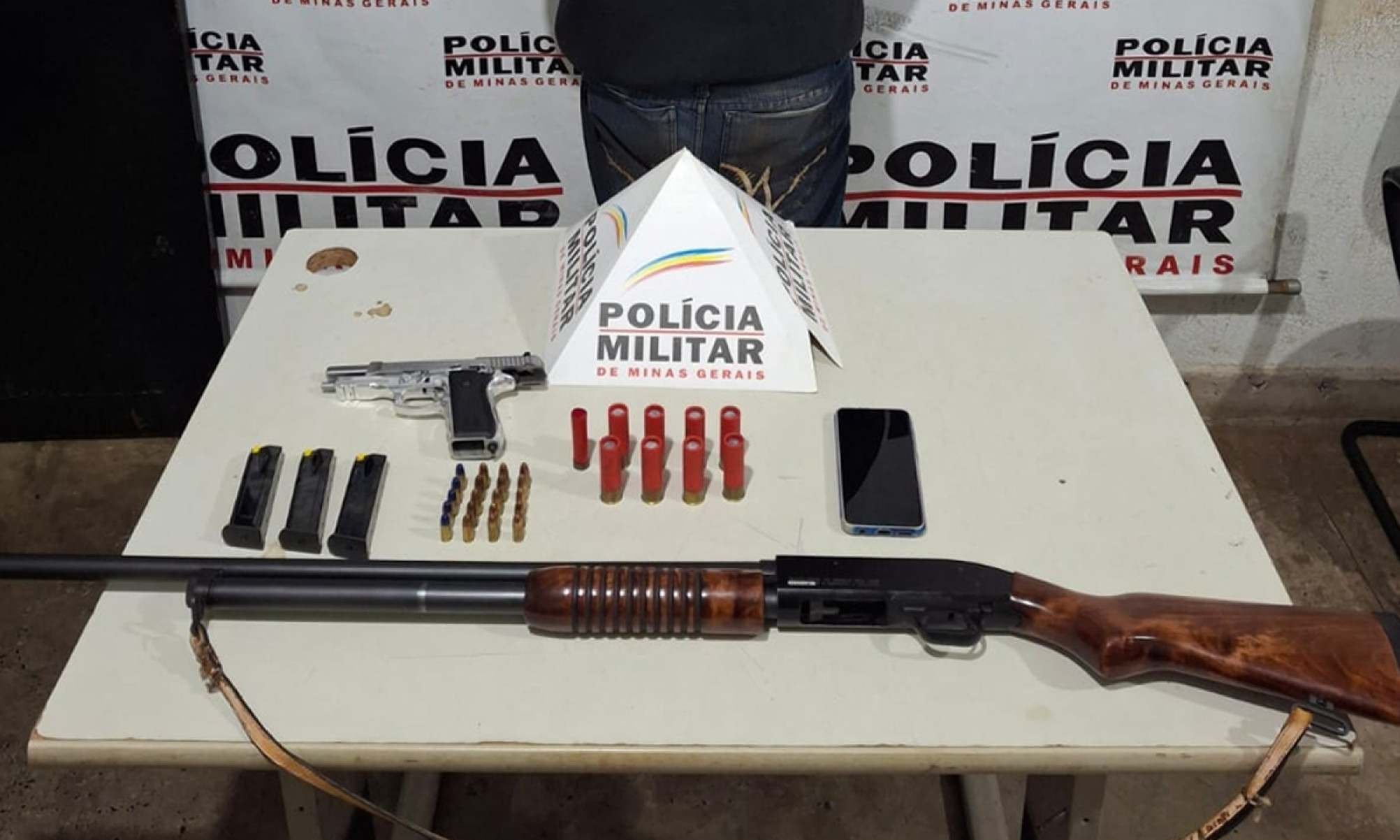 Na casa do suspeito, segundo a PM, foram apreendidas uma espingarda calibre 12 com oito munições, uma pistola Taurus 9mm com carregadores e 20 munições, um cartucho calibre 28 deflagrado e um celular.