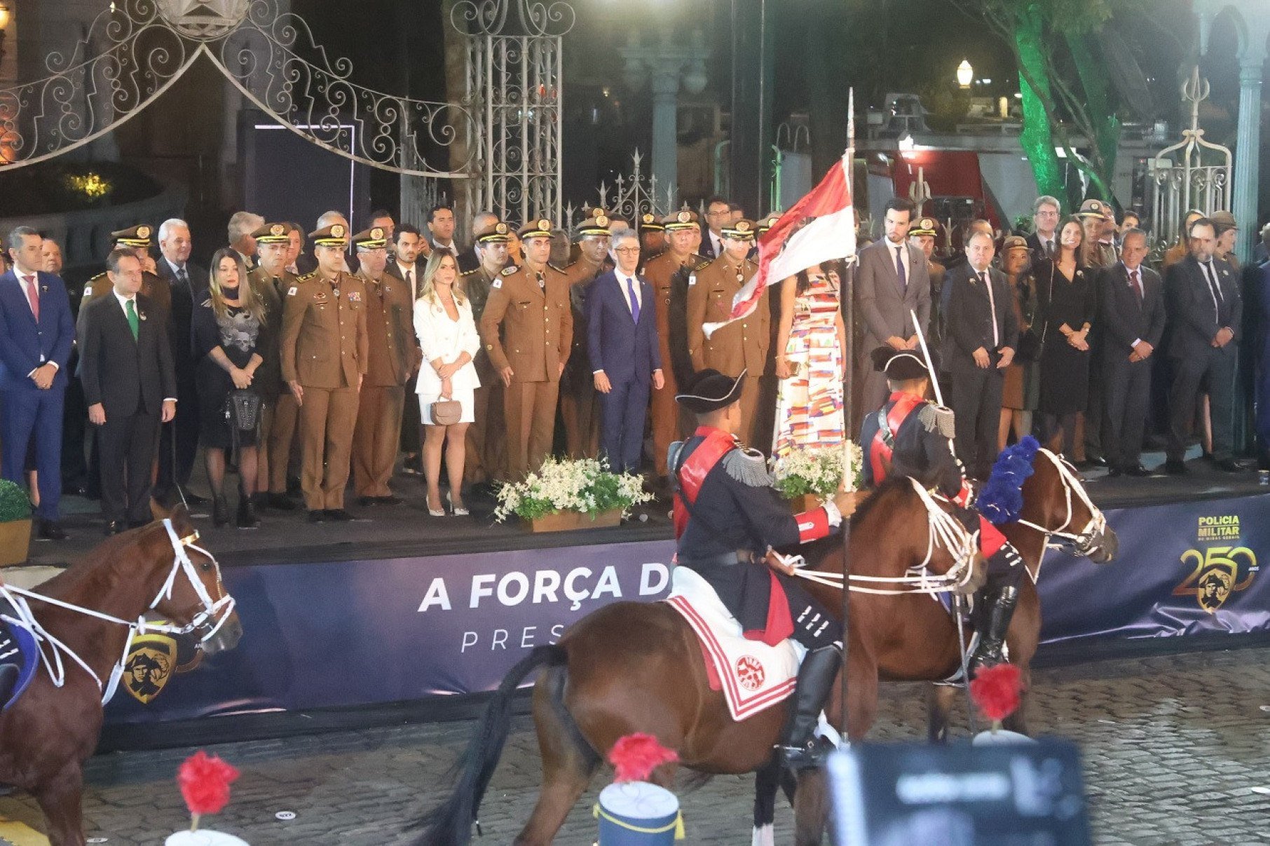 Uma solenidade na Praça da Liberdade, na Região Centro-Sul de Belo Horizonte, marcou as comemorações dos 250 anos da Polícia Militar de Minas Gerais (PMMG) na noite desta segunda-feira (9/6). A cerimônia incluiu desfiles, discursos do governador Romeu Zema (Novo) e do comandante-geral da corporação, coronel Carlos Frederico Otoni Garcia, além da entrega da edição especial da Medalha Alferes Tiradentes, concedida apenas aos cinquentenários da força de segurança.