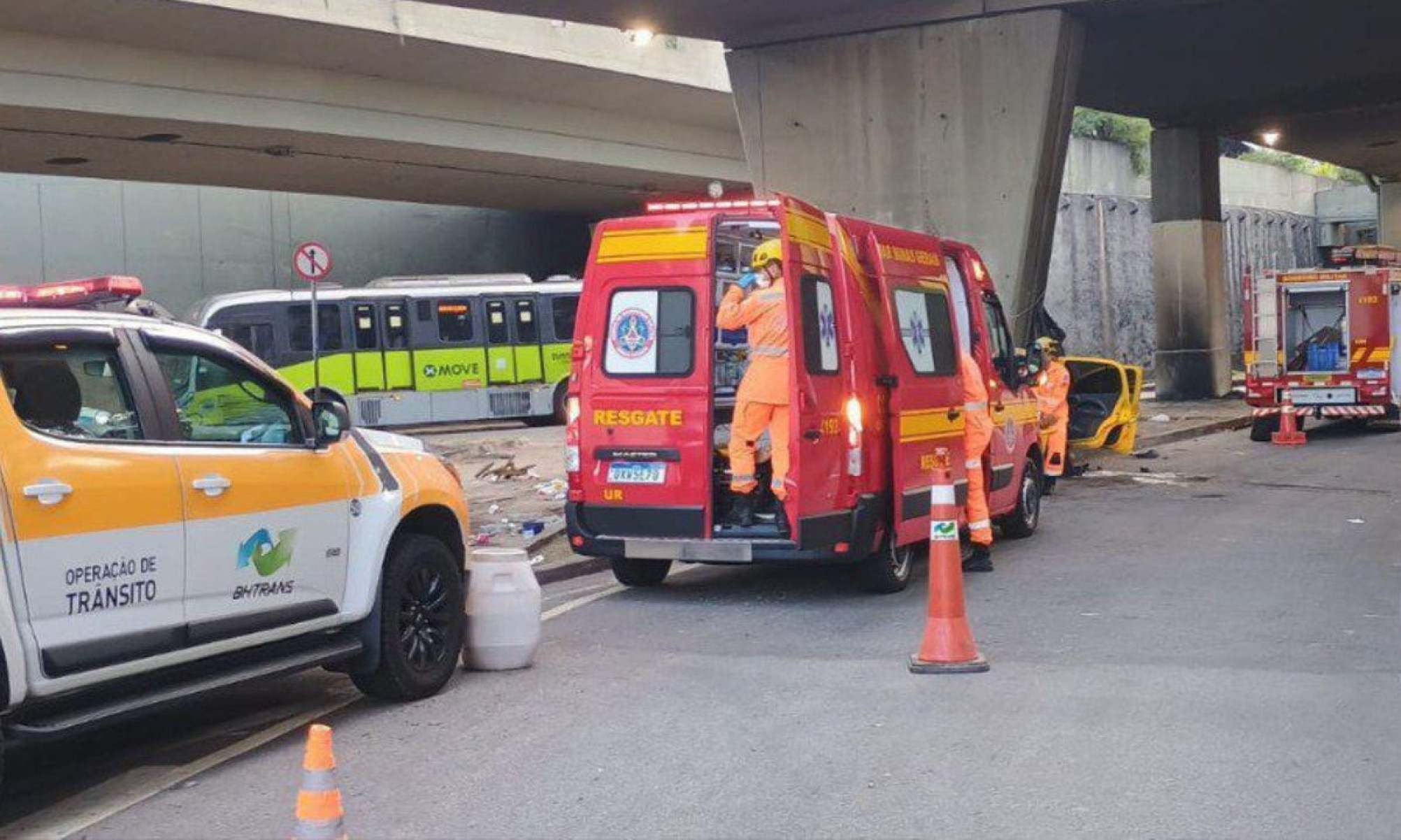 Cinco ocupantes de um carro ficaram feridos depois que o veículo colidiu contra o pilar de um dos viadutos do Complexo da Lagoinha, na Região Centro-Sul de Belo Horizonte, na manhã deste sábado (14/6).