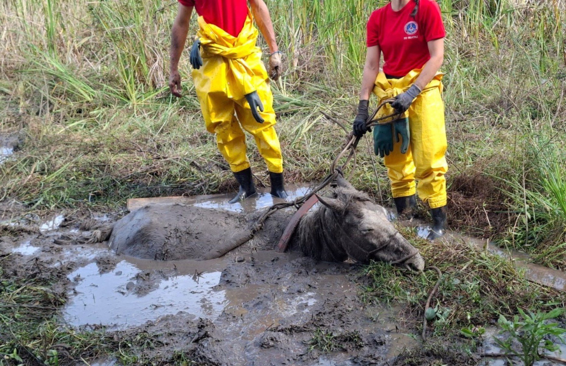 A operação de salvamento aconteceu na zona rural da cidade. O animal ficou com boa parte do corpo submerso.