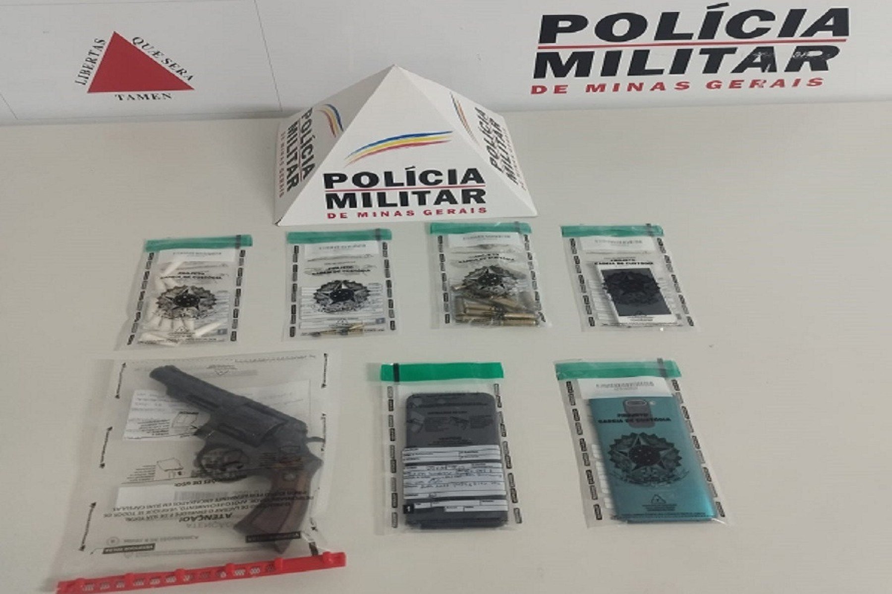 Numa revista no interior da casa, foram encontradas uma sacola que continha um revólver calibre 38, com numeração raspada; munições intactas, calibre 22; três telefones celulares.