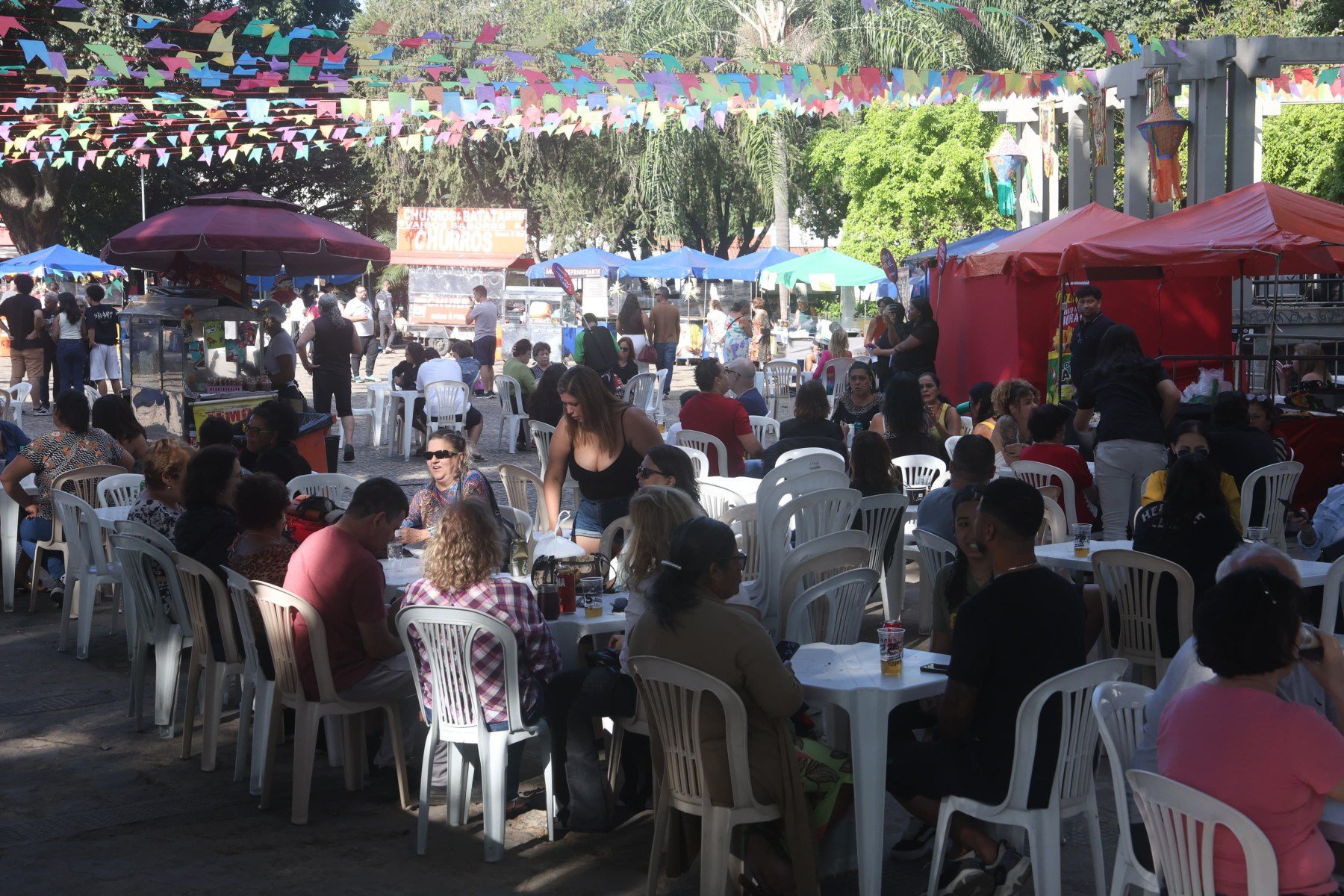 Na tarde de hoje, o movimento começou tímido, mas, aos poucos, as pessoas foram chegando e tomando conta da praça, que está toda enfeitada em clima de São João. Nessa toada, barraquinhas oferecem uma série de propostas gastronômicas.