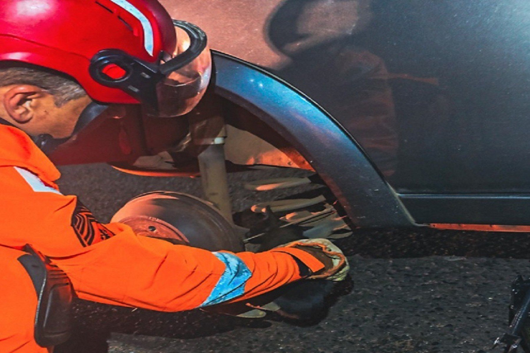 O chamado para os bombeiros foi feito pelo dono do veículo que, ao se aproximar, ouviu miados e percebeu que o animal estava preso na parte interna da roda traseira direita.