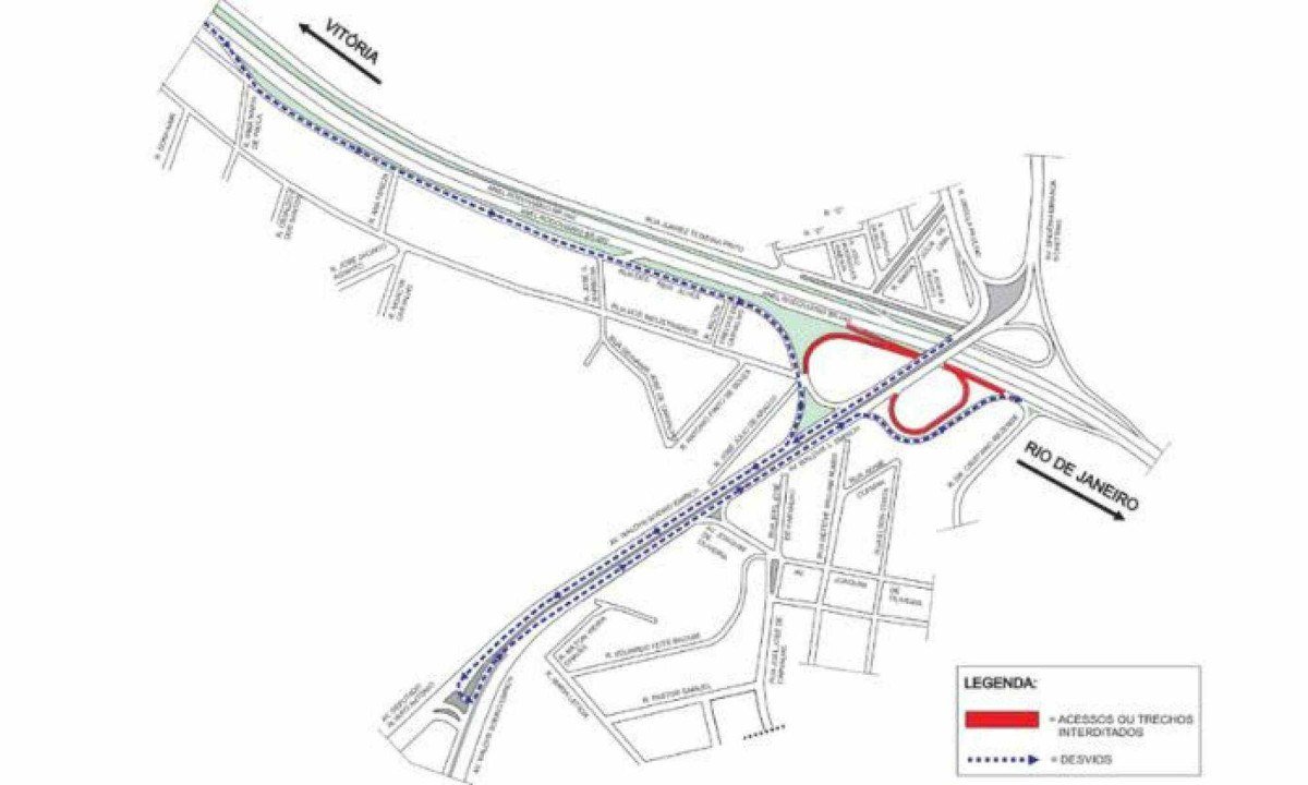 A alça do trevo do Bairro Betânia, que liga a Rua Úrsula Paulino à marginal do Anel no sentido Rio de Janeiro também ficará interditada, somente estará liberado o acesso da alça à Rua dos Industriários.
