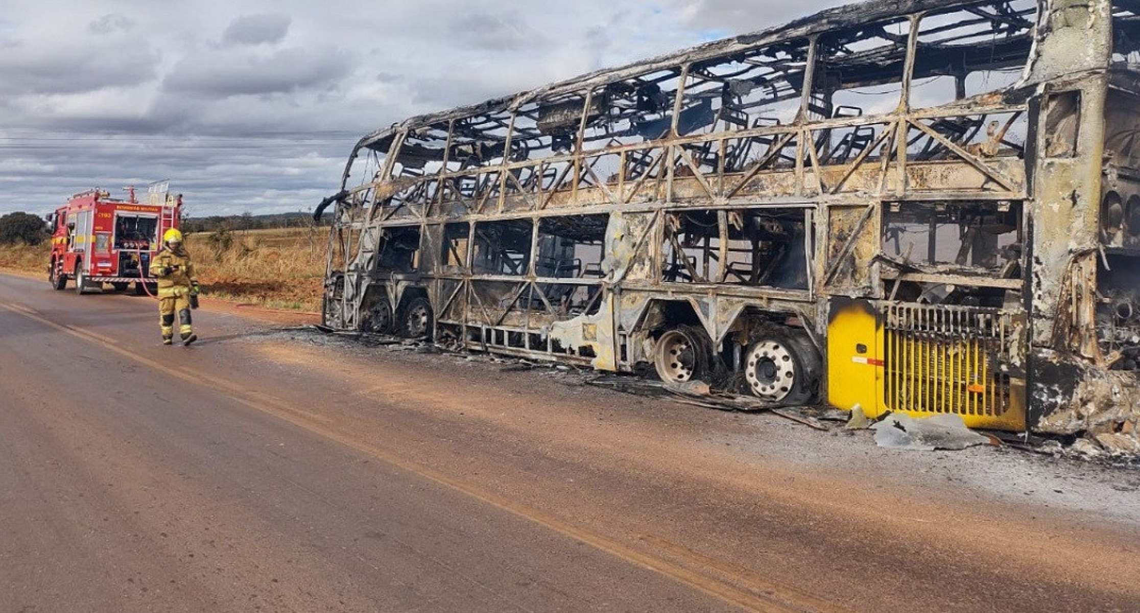 Ônibus de excursão é totalmente destruído por incêndio na MG-188